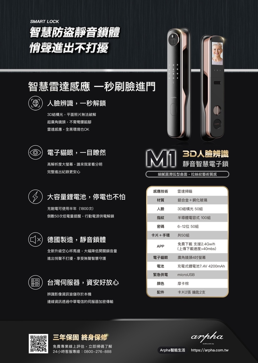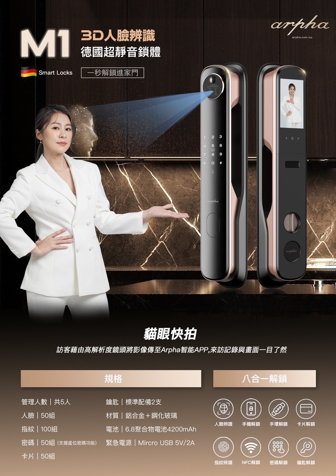 Arpha M1 ULTRA 人臉 指紋 卡片 密碼 鑰匙 貓眼 遠端